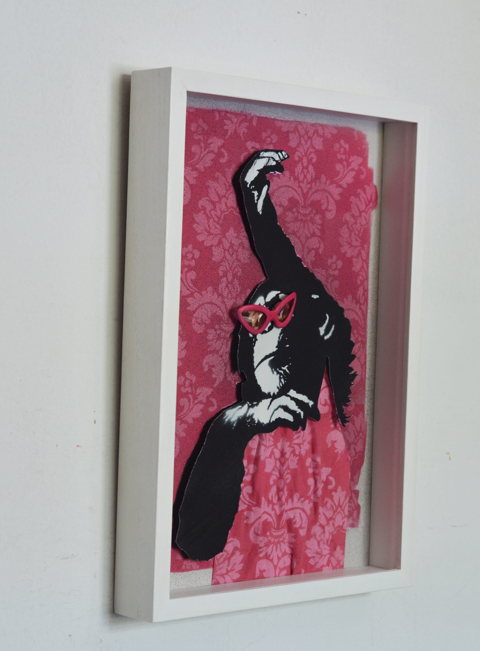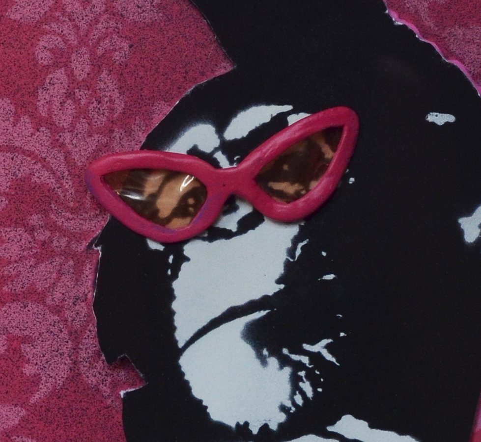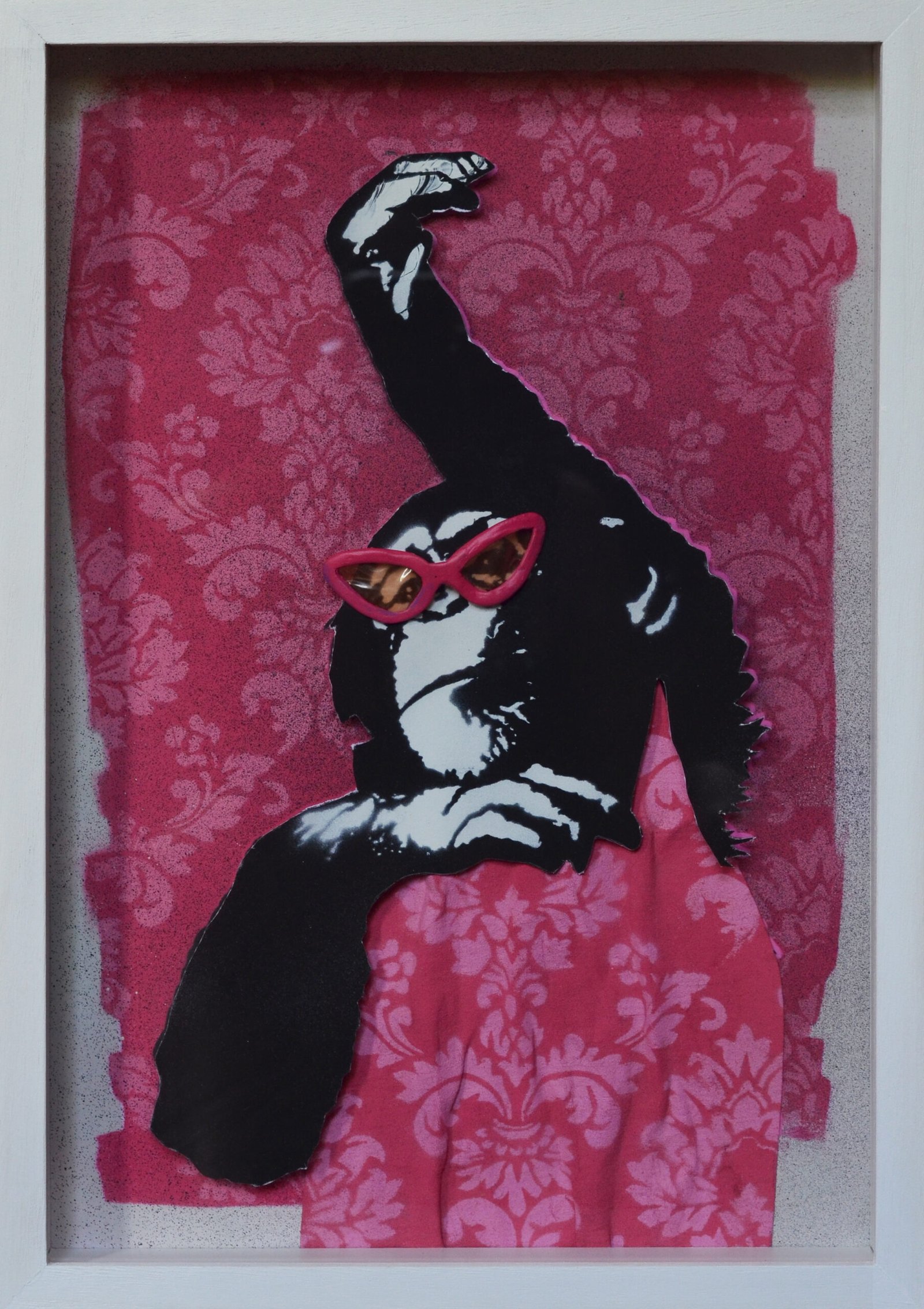 La figura —recortada, contundente— irrumpe sobre un fondo ornamental que remite a lo clásico, generando un contraste inmediato.