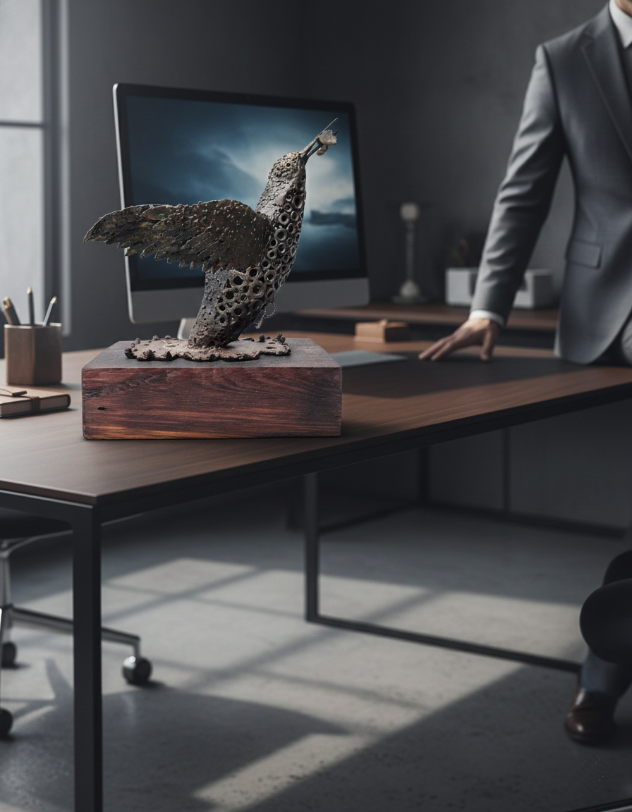 “Martin Pescador 1”, representa la armonía entre el ingenio humano (herramientas mecánicas) y el espíritu libre de la fauna autóctona.