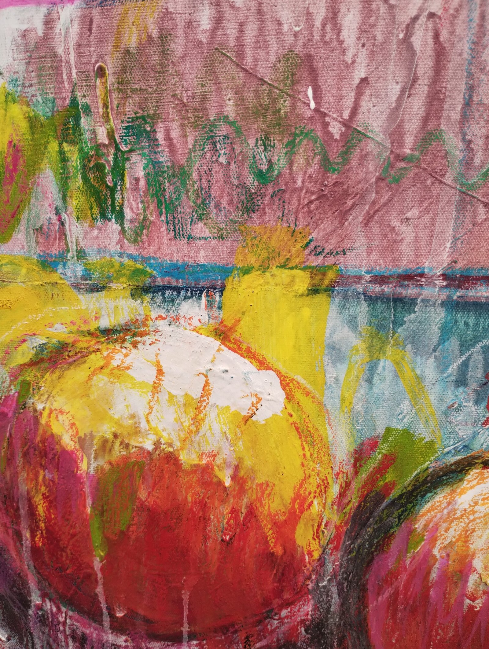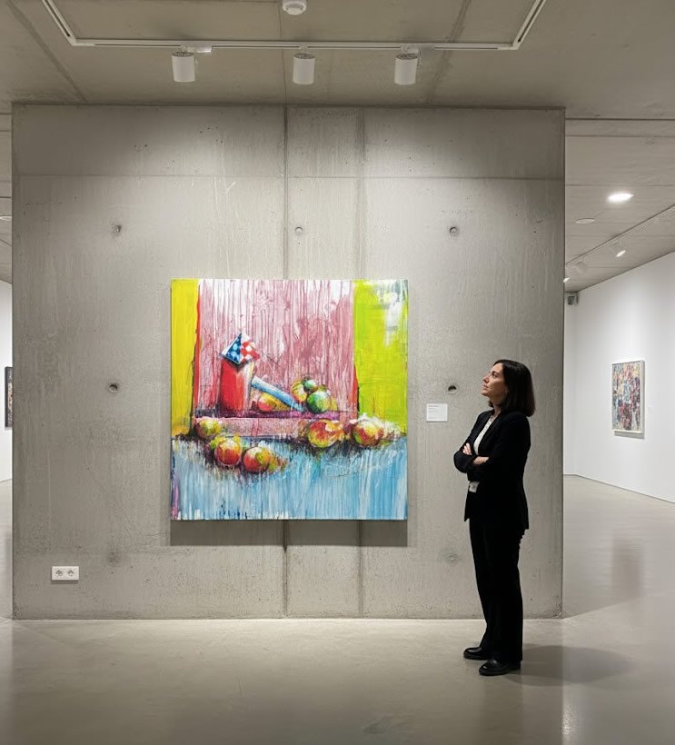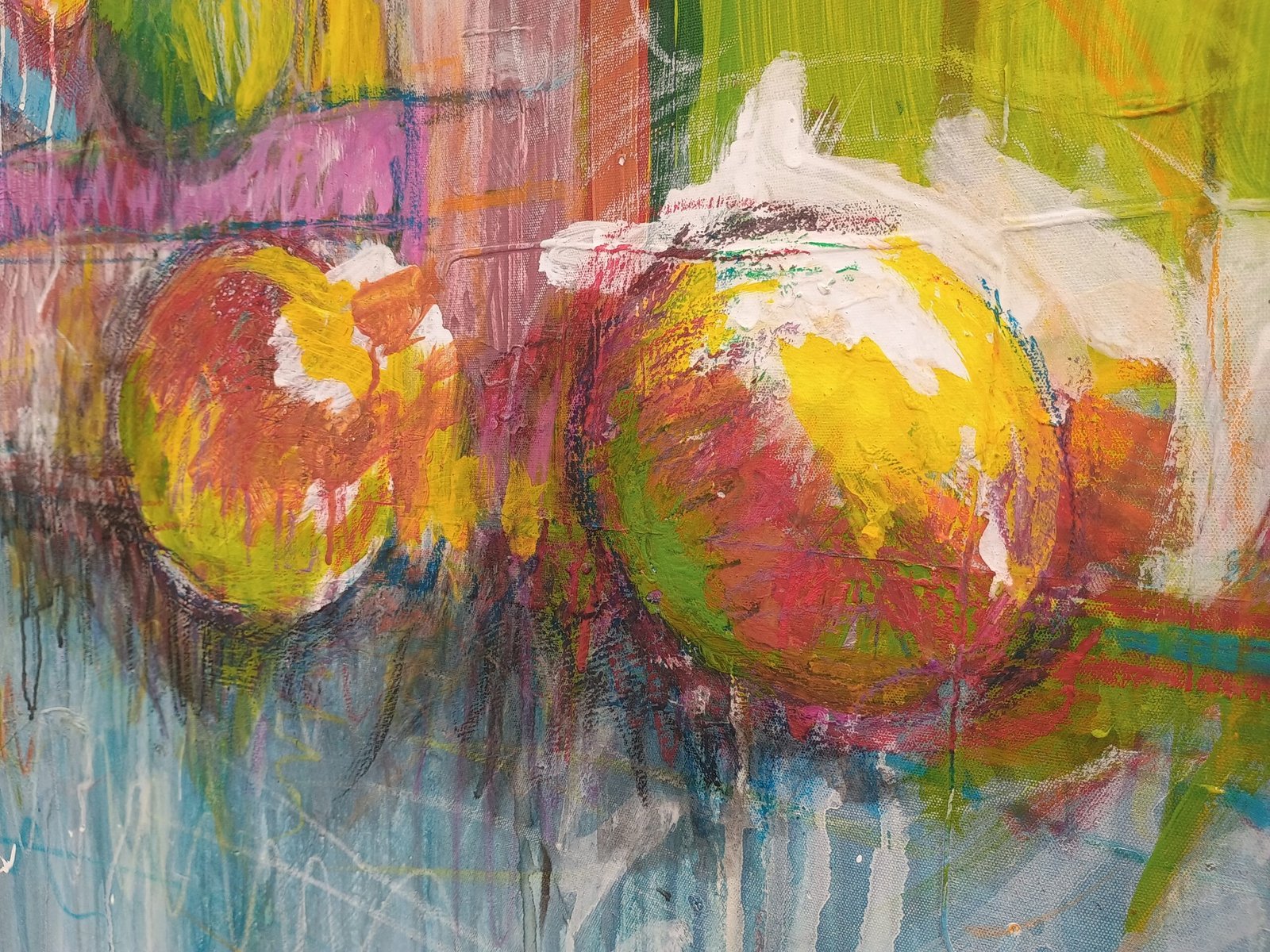 En “Naturaleza no tan muerta con frutas y libro” cada fruta vibra con energía propia, y el libro simboliza el impulso creativo que nunca se apaga. Es una obra que invita a sentir, no solo a mirar.
