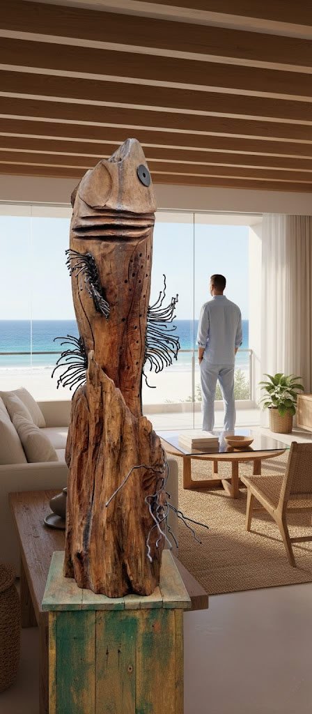 Una obra de gran verticalidad y contraste textural, donde la calidez de la madera tallada choca con la frialdad industrial de los filamentos de hierro, creando un punto focal magnético.